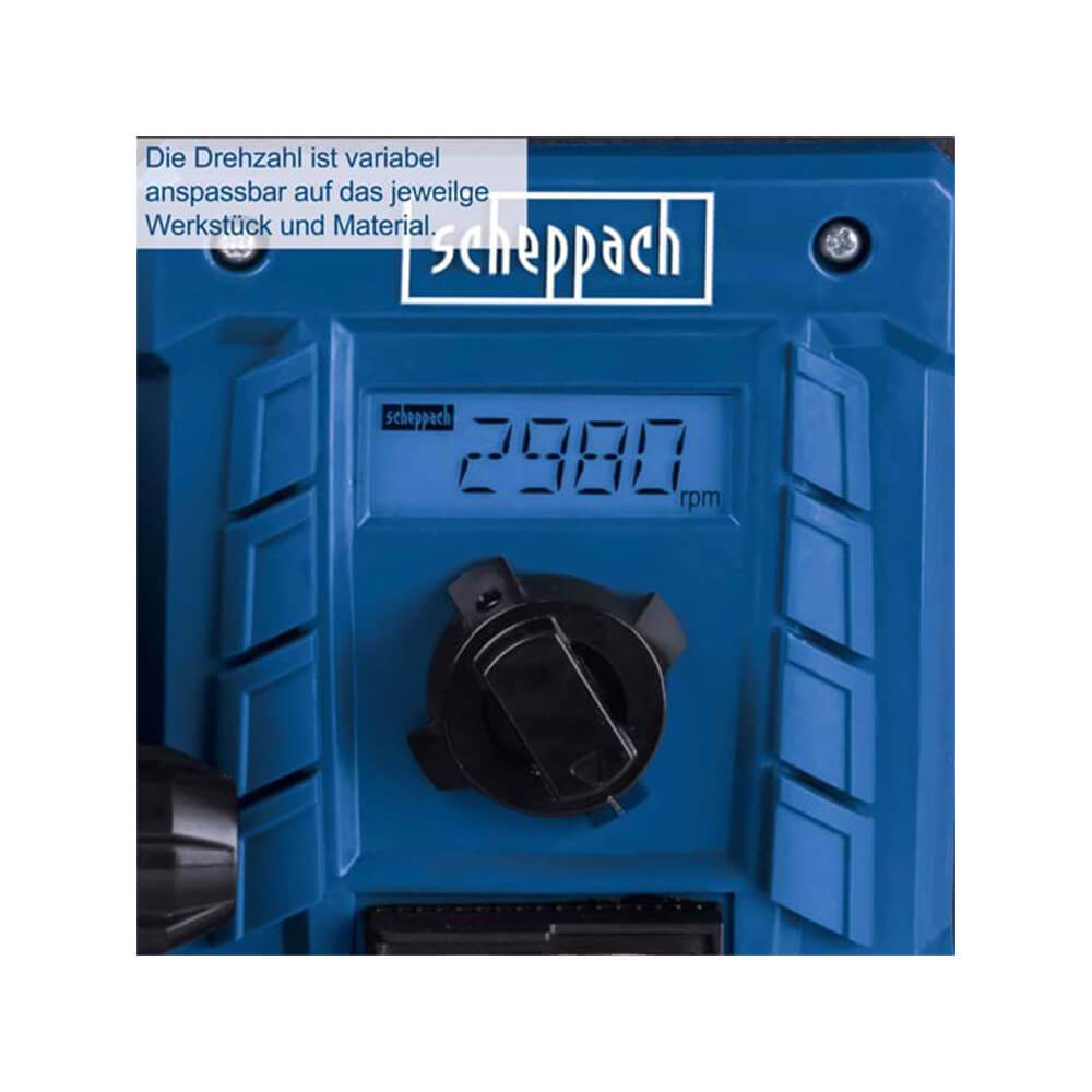 Scheppach BTS800 Vario er vönduð og stöðug belta- og skífuslípivél sem hentar vel fyrir verkstæði. Vélin er þung og því titringslítil, sem tryggir nákvæma og örugga vinnu. Hún er búin stiglausri hraðastýringu þar sem hraðinn birtist á skýrum skjá, sem gerir aðlögun að mismunandi verkefnum einfaldari. Bæði slípibelti og slípskífa eru fest með riflás fyrir hraðari og öruggari skipti.