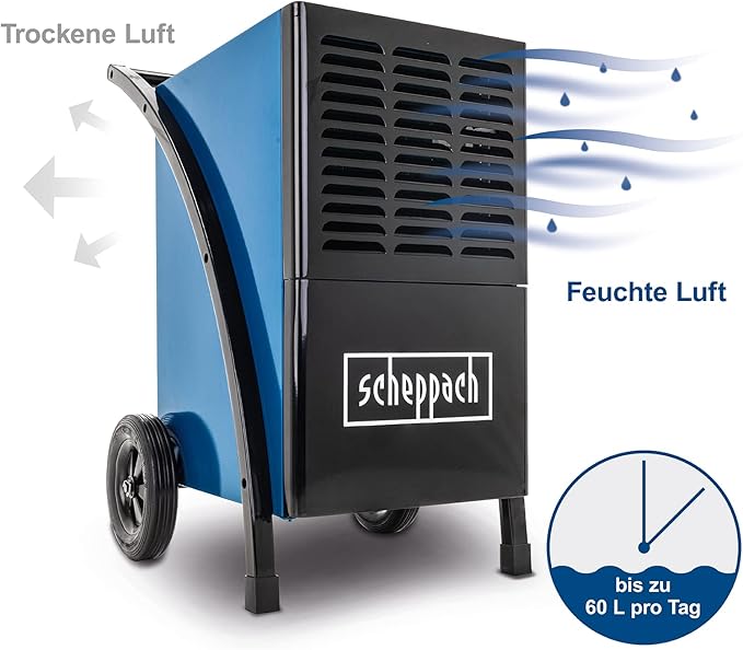 Öflugur Scheppach rakaskilja með 60 L daglegu afköstum, hentugur til að þurrka rými frá 60–80 m² og halda lofti hreinu og rakalausu.
