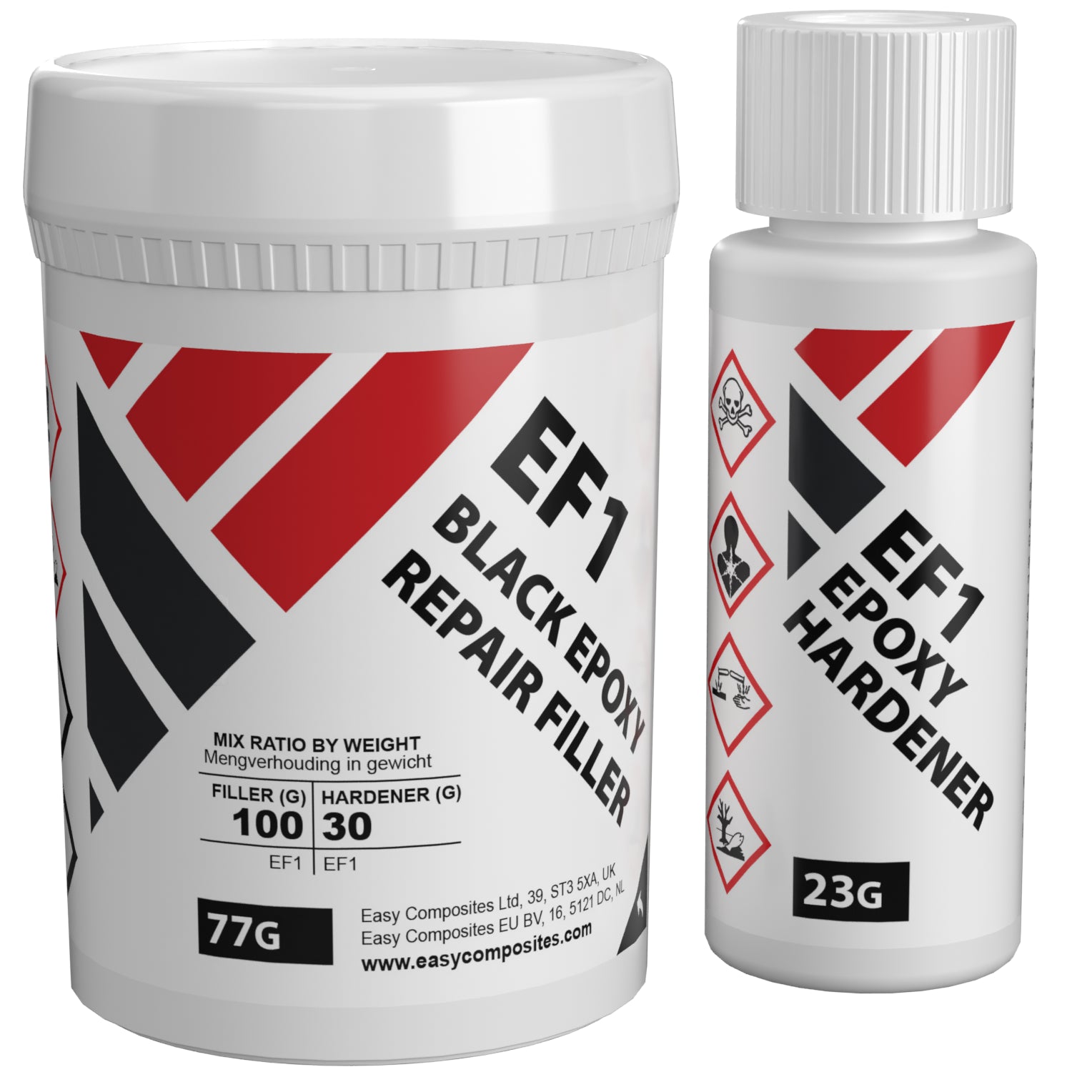 Viðgerðarefni fyrir epoxy – svart EF1 (100 g) er hraðvirkt fylliefni sem er sérstaklega hannað fyrir viðgerðir og uppfyllingu á hlutum úr koltrefjadúkum eða öðrum epoxy samlokueiningum. Efnið tekur sig mjög hratt, sem gerir það hentugt fyrir viðgerðir þar sem tími skiptir máli.